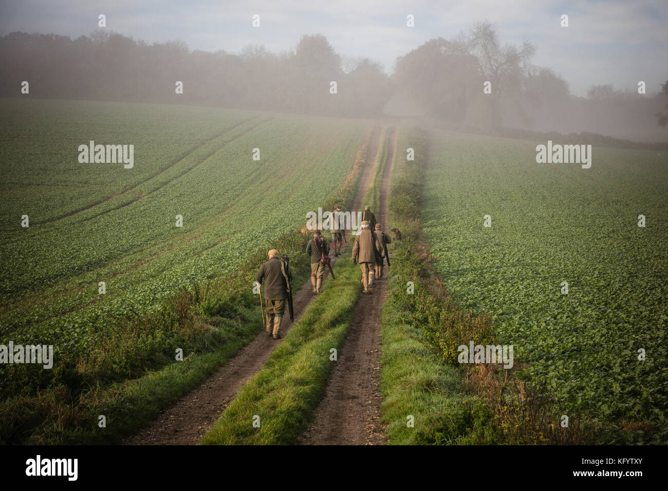 Gentlemen guns walking to their pegs on a pheasant shoot on a misty morning, Hampshire, England