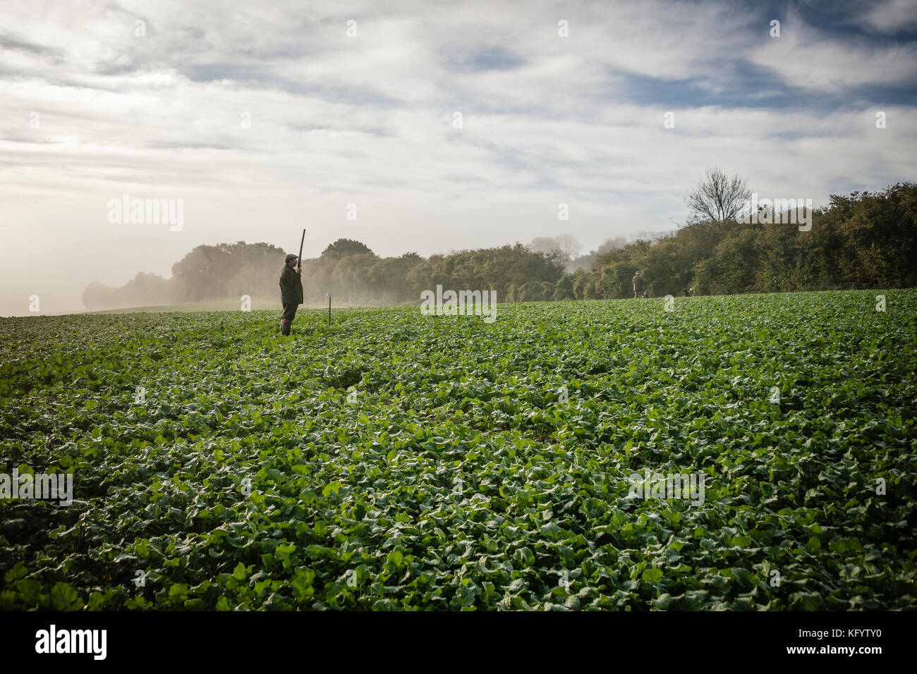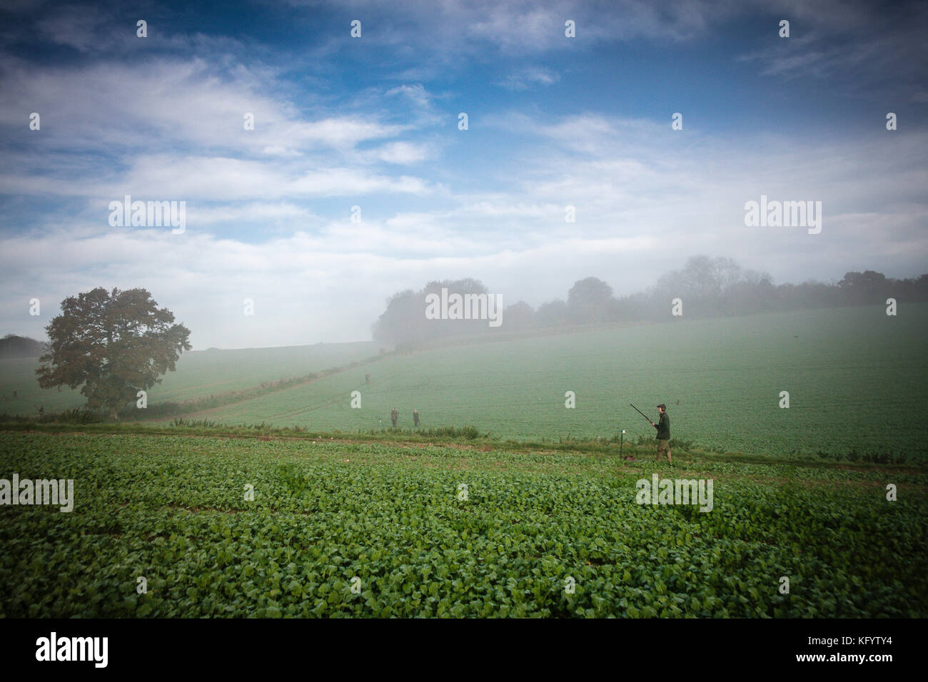 Gentlemen guns waiting at their pegs on pheasant shoot on a misty morning, Hampshire, England
