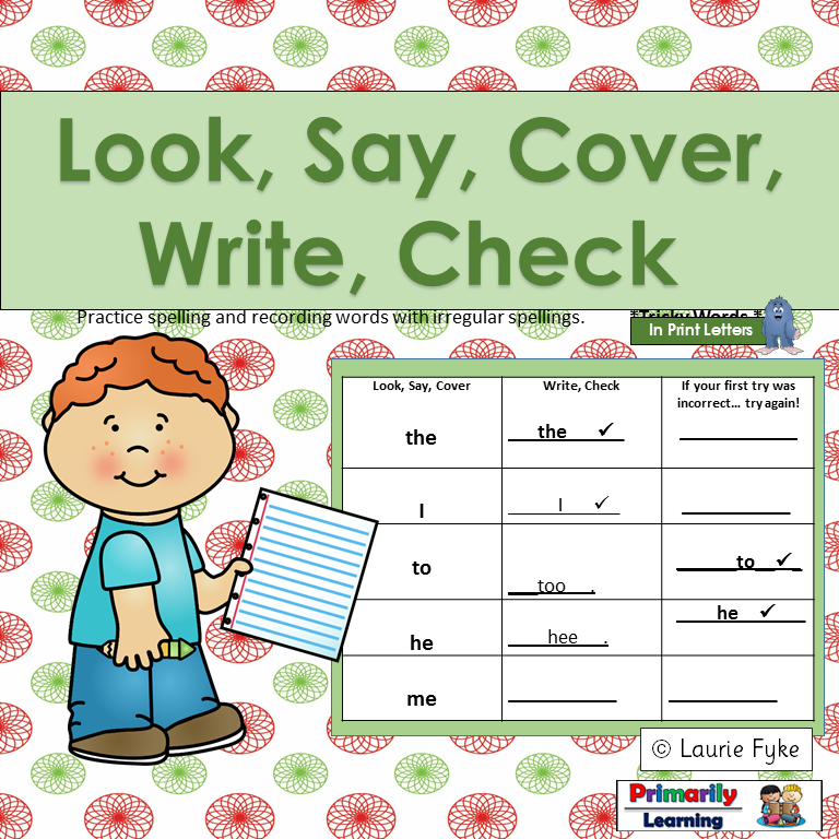 To excel in their spelling, teachers have suggested using the strategy of look, say, cover, write, check in the classroom and at a home. A simple method of using look, say, cover, write, check is to use a grid template so children can test themselves a few times with their spelling. For example, if a child is given a task to learn to spell.