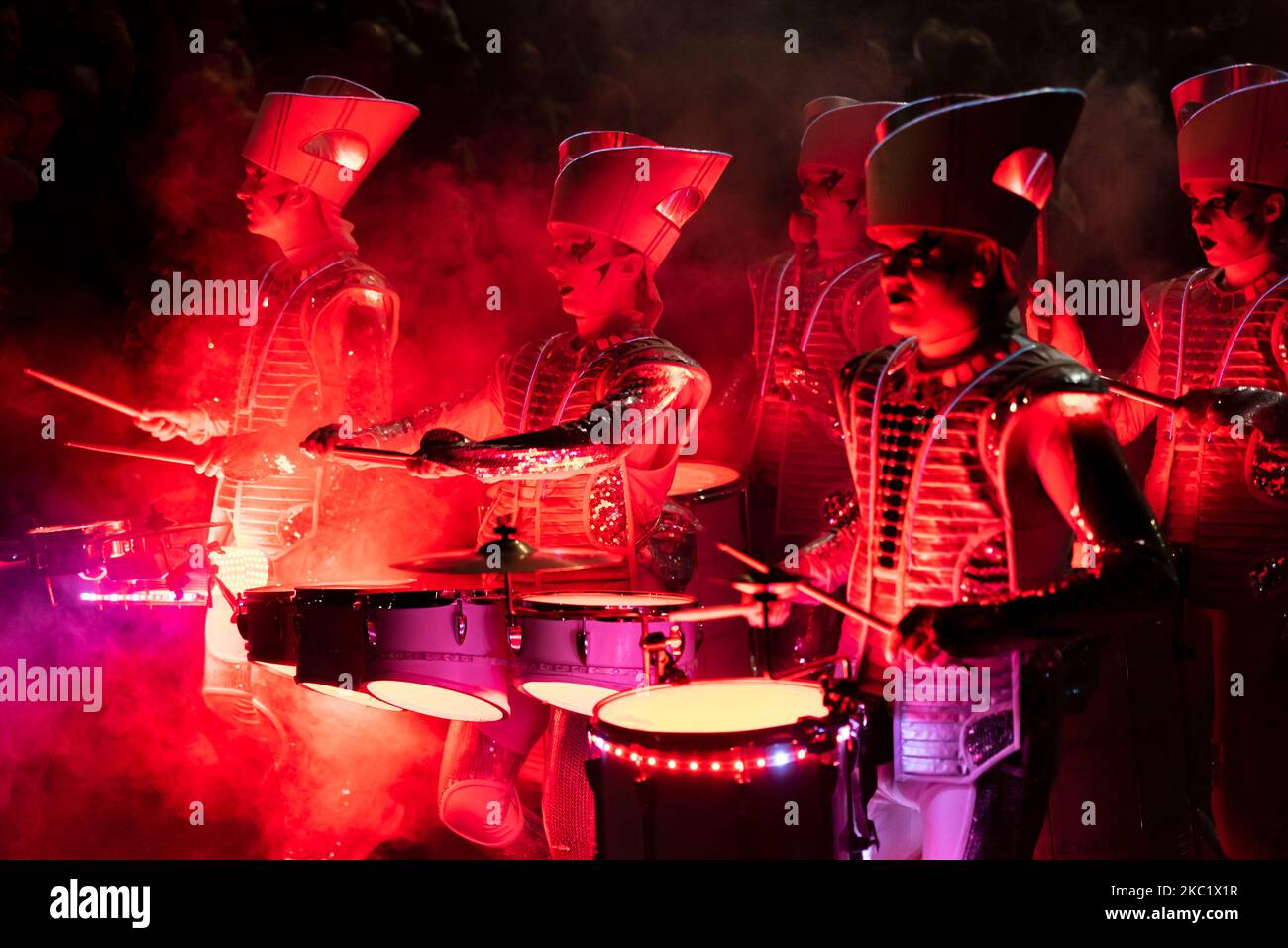 Spark! drummers at the Halloween Parade in Southend on Sea, Essex, UK. Illuminated nighttime
