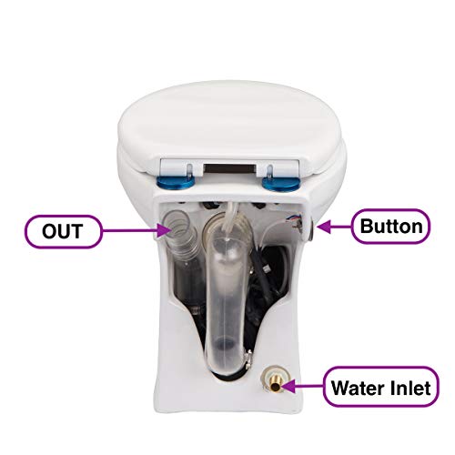 The china toilet bowl has a macerator pump built into it and as a result doesn't require a gravity flow tank; the flush and pump cycle occurs after pushing a button on the toilet bowl, and water is sent through the bowl while the macerator and pump handle waste and paper. There is a 10-15 second cycle for the motor before the bowl is refilled.